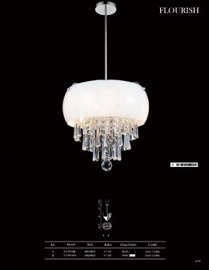 FLOURISH B A Φ5" 1" 72" 13" Φ14" A B No. Model Watt Bulbs Glass Shade Crystal A 5114P14B MAX40W 4×G9 Black Clear Crystal B 5114P14W MAX40W 4×G9 White Clear Crystal 653 654